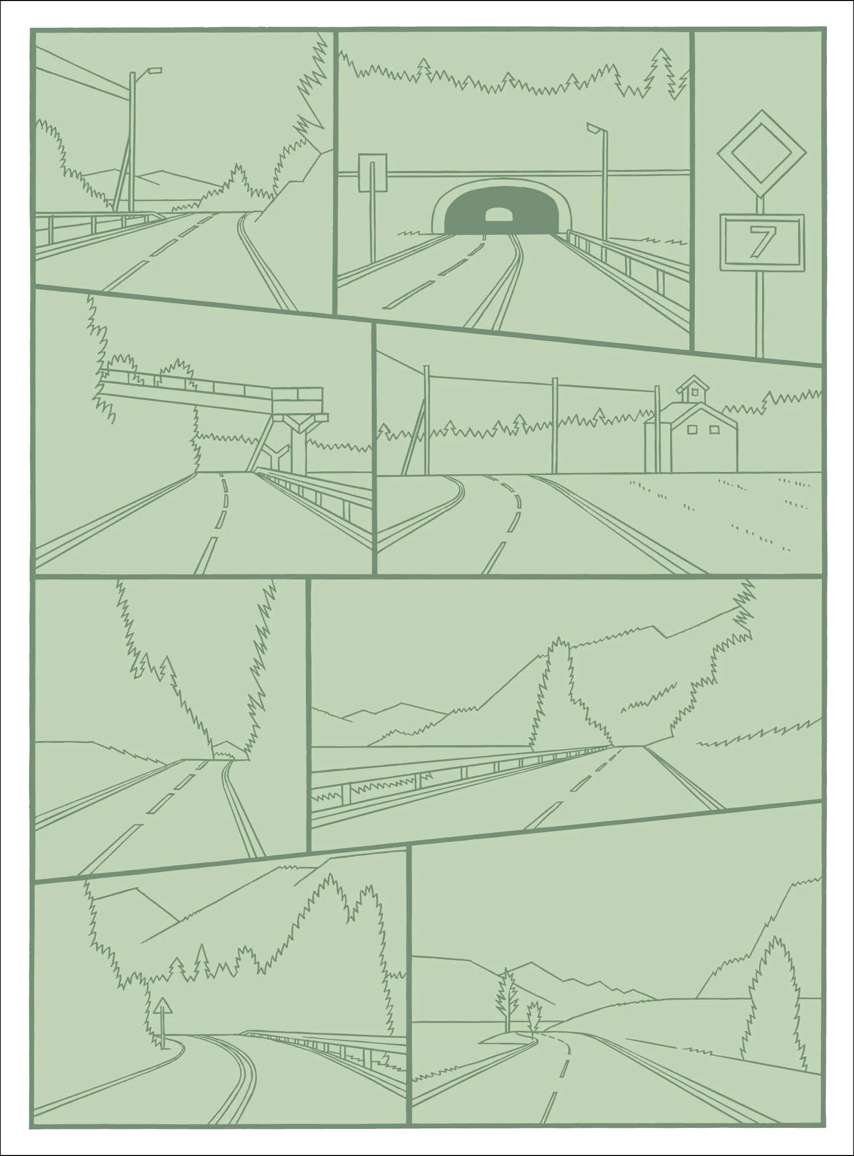 RIKSVEI 7. Silketrykk i format 50x70. Signert og nummerert i 50 eks. Motivet er basert på forsatsbladet til boken AUTOMOBILFABRIKKEN FISKE (2015) der Riksvei 7 spiller en hovedrolle.